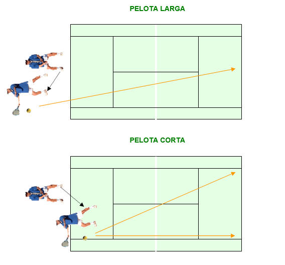 - Pelota corta: hablamos de pelota corta cuando el golpe se realiza con los pies dentro de la pista.Ante pelotas cortas, daremos la oportunidad de cambiar la dirección del golpe o de colocar la pelota al hueco.