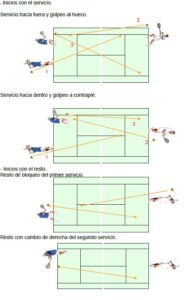 - 1er Servicio y siguientes golpeos: Puntos con 2 o 3 servicios (2 primeros y 1 segundo); Sirviendo abierto a la «T» o al cuerpo y siguientes golpeos.